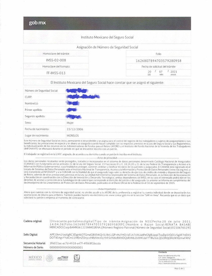 Hoja de preafiliacion al IMSS (NSS-Número de Seguro Social) |